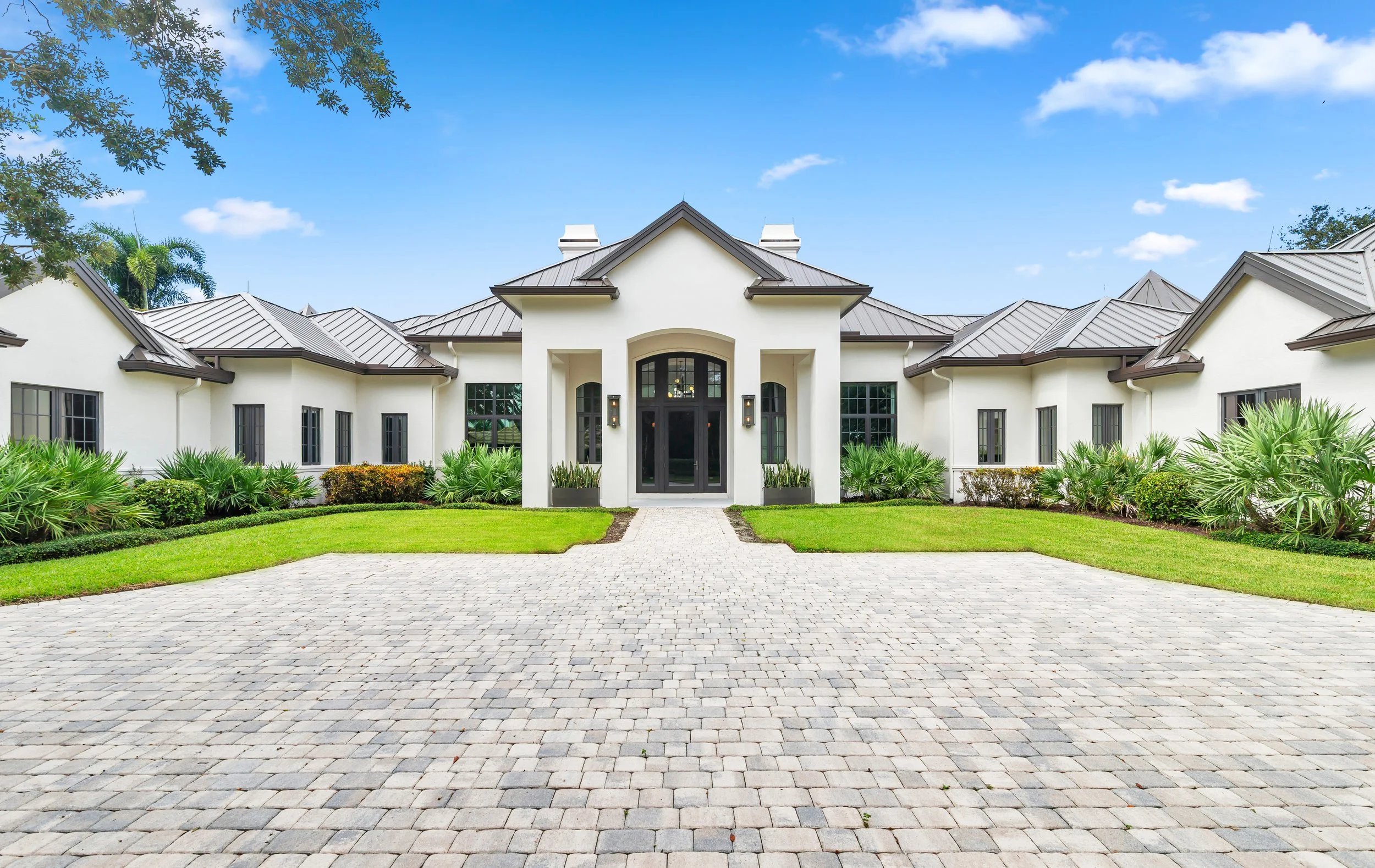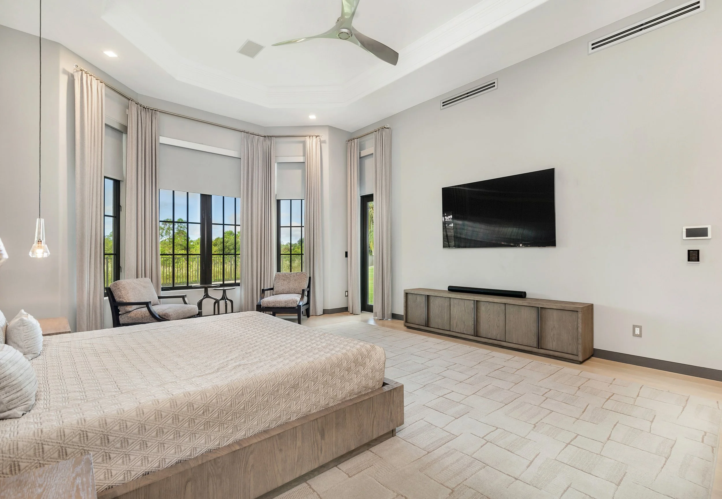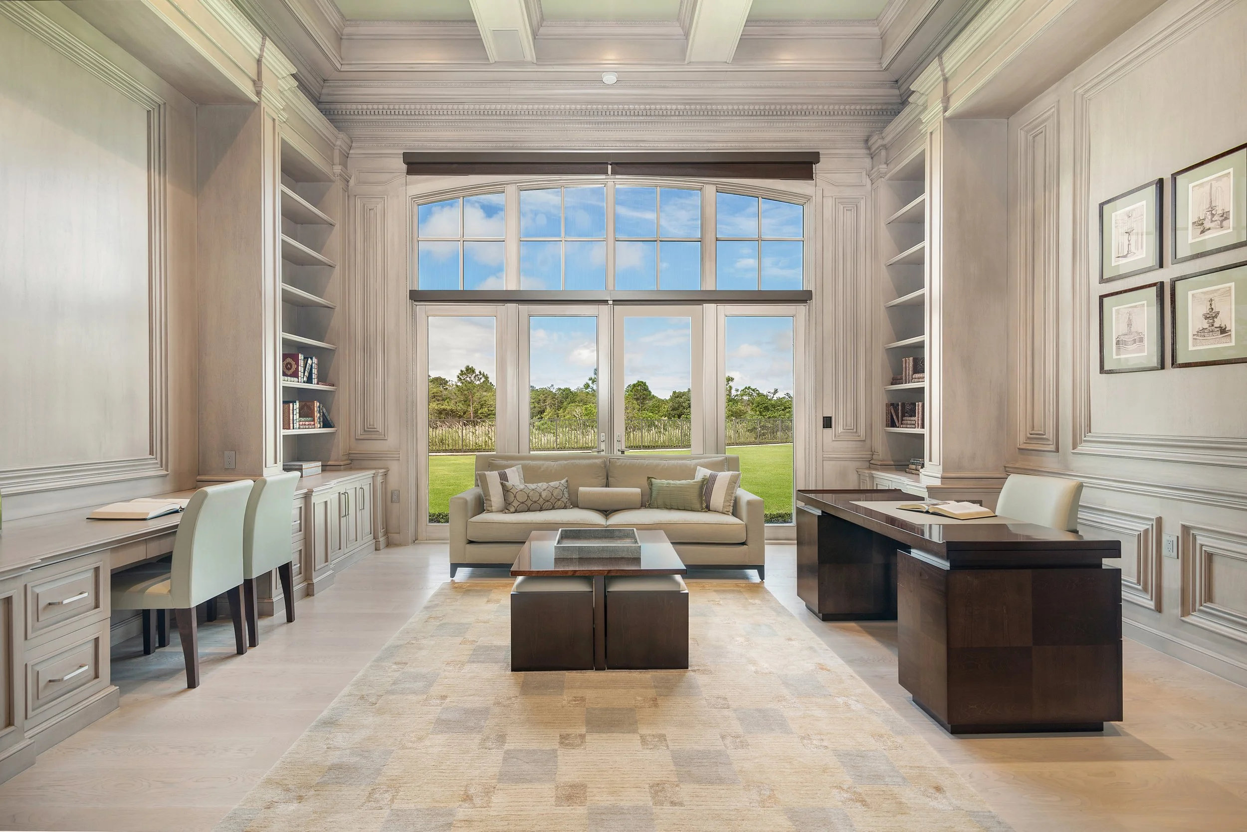 The property includes a game room with a bar, a wood-paneled library, a state-of-the-art fitness studio, and flexible retreats perfect for work or leisure. A hidden hurricane safe room adds an extra layer of security.
